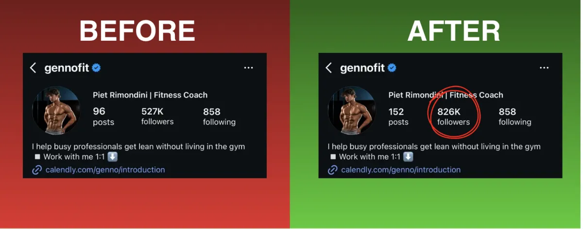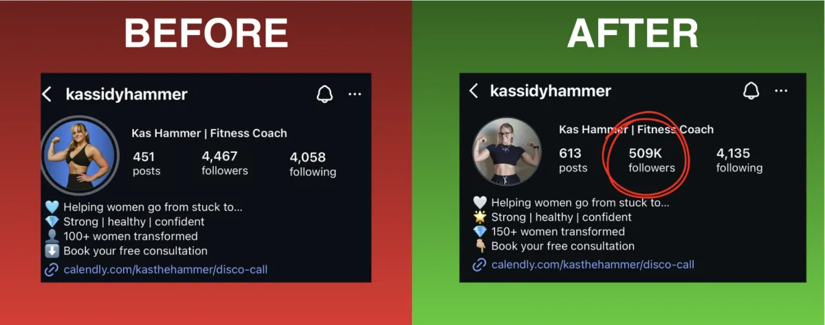 One of my clients is a fitness coach and her target audience is middle aged women. We grew her account from 3k followers to 500K in 6 months while another fitness coaching client of ours grew from 3k followers to 300k followers in 2 months. I have another client that started at 500k followers to now over 800k followers in 1.5 months.